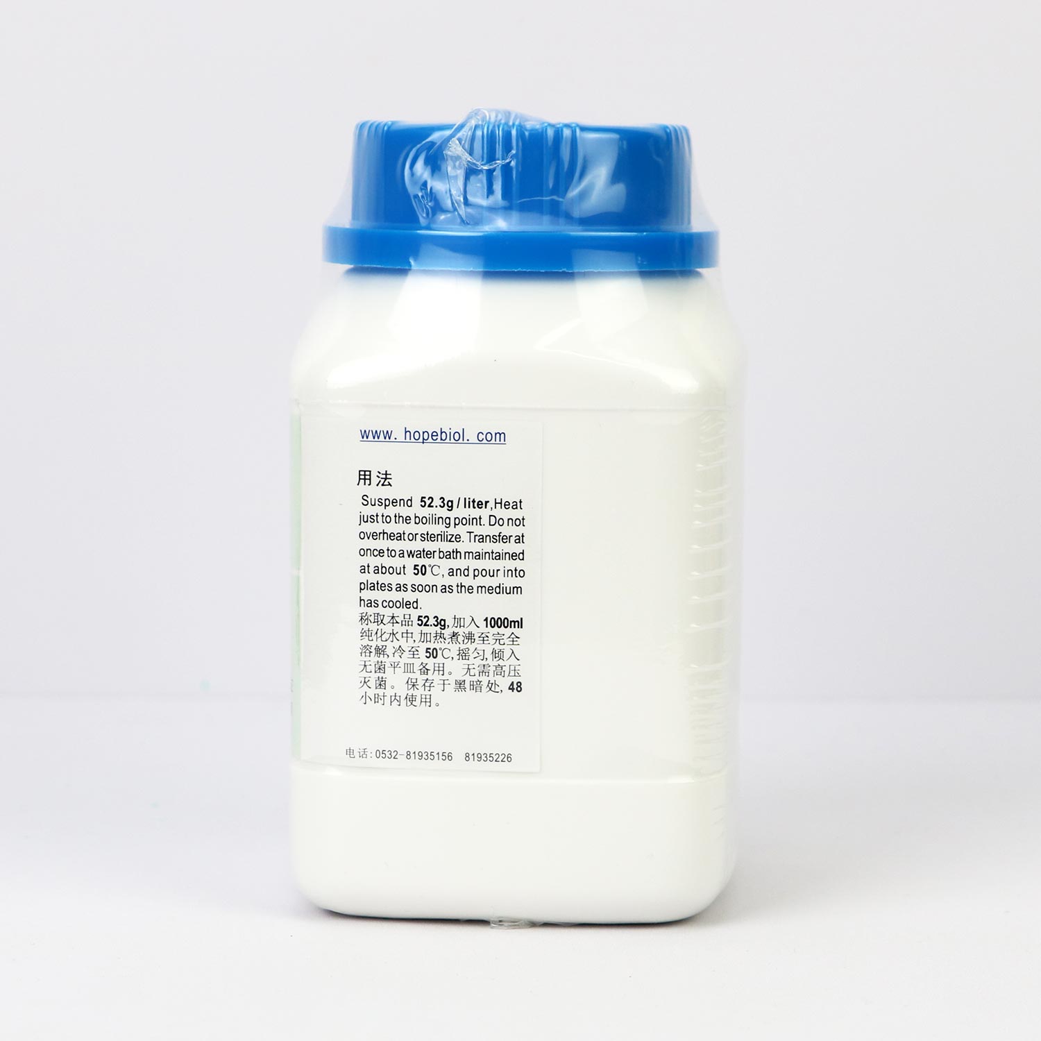 称取本品52.3g,加入1000ml纯化水中,加热煮沸至完全溶解,冷却至50℃,摇匀,倾入灭菌平皿备用。无需高压灭菌。保存于黑暗处,48小时内使用。