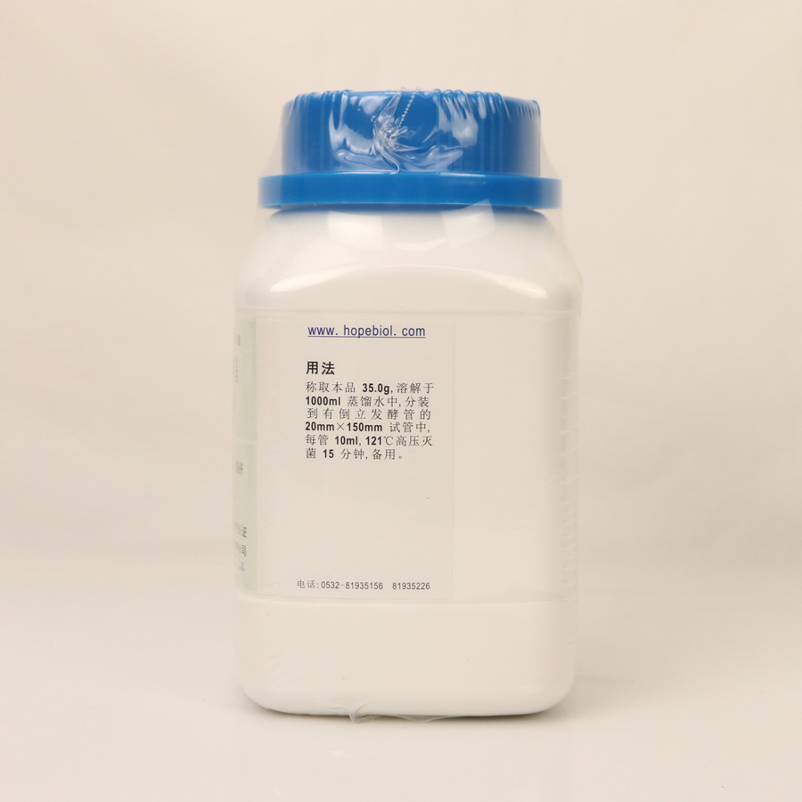 称取本品35.0g,加热溶解于1000ml蒸馏水中,分装到有倒立发酵管的20mm×150mm试管中,每管10ml ,121℃高压灭菌15分钟,备用。 质量控制和典型特征: