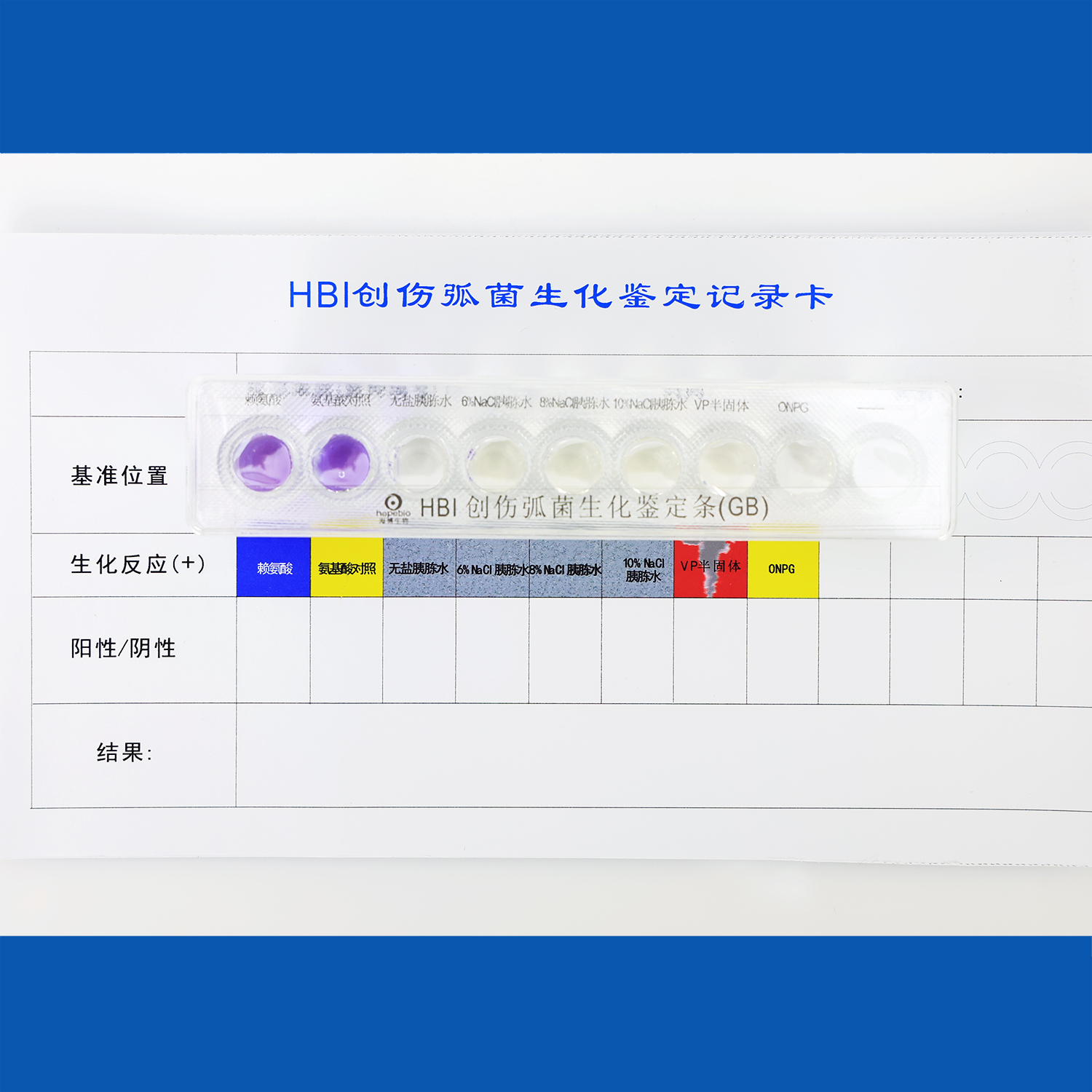 用于创伤弧菌的生化鉴定,每条组成:无盐胰胨水,6%氯化钠胰胨水,8%氯化钠胰胨水,10%氯化钠胰胨水,3%氯化钠VP半固体培养基,3%氯化钠赖氨酸脱羧酶,3%氯化钠氨基酸脱羧酶对照,3%氯化钠ONPG,氧化酶试纸1包,共9种生化反应。(GB标准)