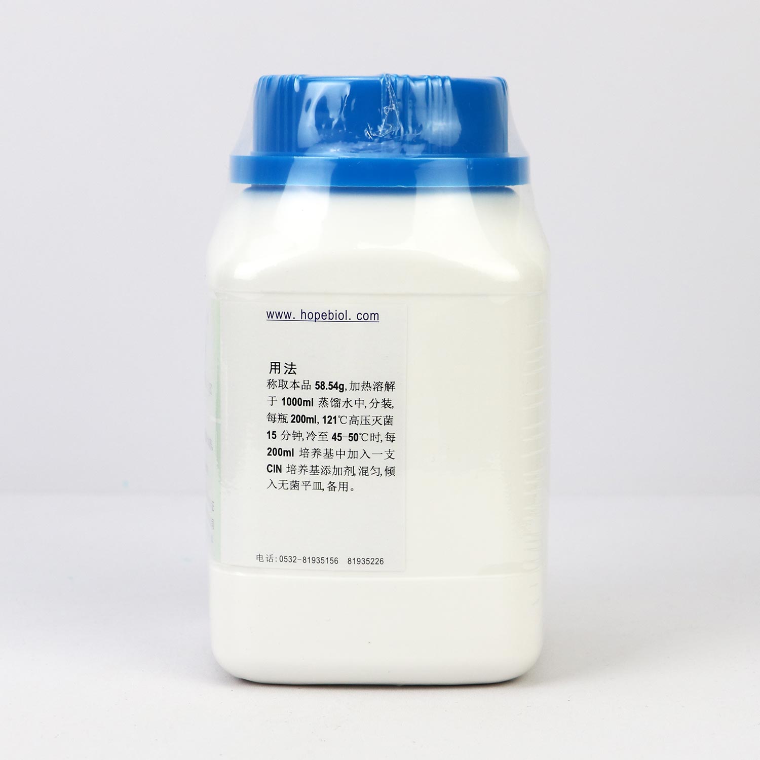 称取本品 58.54g,加热溶解于1000ml 蒸馏水中,分装,每瓶200ml,121℃高压灭菌15 分钟,冷至 45-50℃时。每200ml培养基中添加1支CIN培养基添加剂。混匀,倾入无菌平皿,备用。