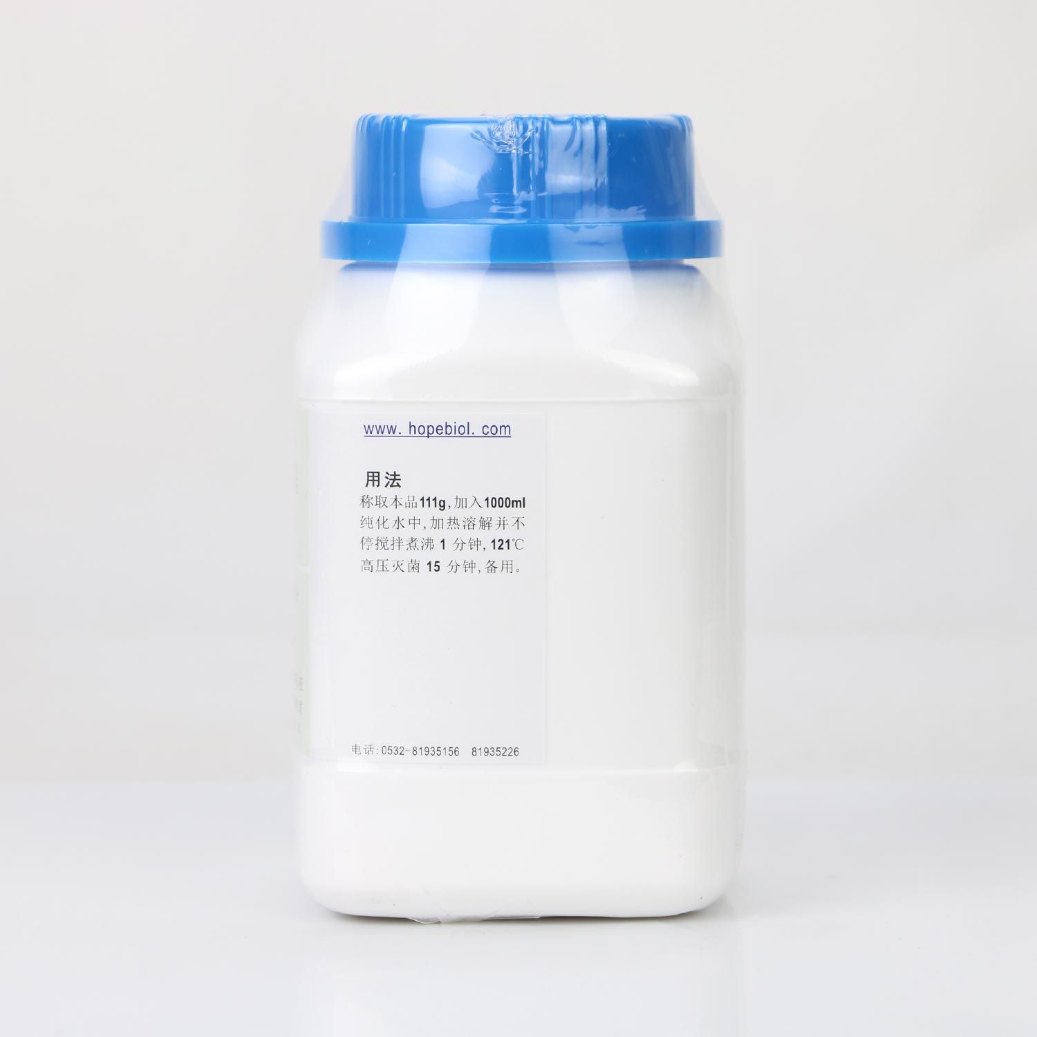 用法:称取本品111.0g,加入1000ml纯化水中,加热溶解并不停搅拌煮沸 1 分钟。121℃高压灭菌15 分钟,冷至 45-50℃左右时,倾入无菌平皿。