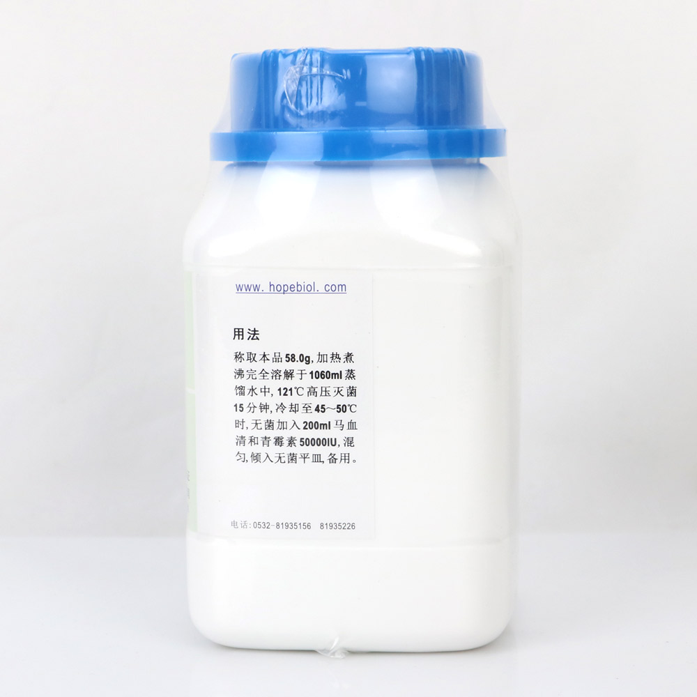 称取本品 58.0g,加热煮沸完全溶解于1060ml纯化水中,121℃高压灭菌15分钟,冷却至45~50℃时,无菌加入200ml马血清或牛血清和青霉素50000IU,混匀,倾入无菌平皿,备用。