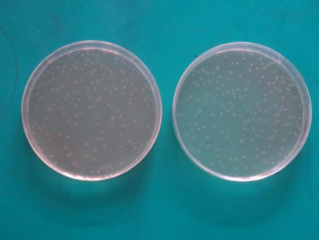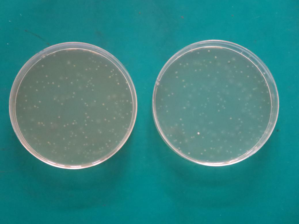 3.加厚倾注法:0177-1的加厚倾注法(图六左)和普通倾注法(图六右)菌落数无明显差别,BD公司TSA的加厚倾注法(图七左)和普通倾注法(图七右)菌落数无明显差别。