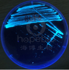 博兹曼军团菌在此培养基中生长良好,培养72-120h后形成灰白色菌落(左图),在紫外灯照射下观察可见到蓝绿色荧光(右图);若接种至BCYE-CYS培养基中则不生长。多数非目标菌在BCYE和BCYE-CYS培养基中均可生长,无荧光现象。