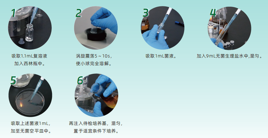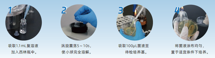 ①加复溶液→②震荡混匀→③涂布/倾注