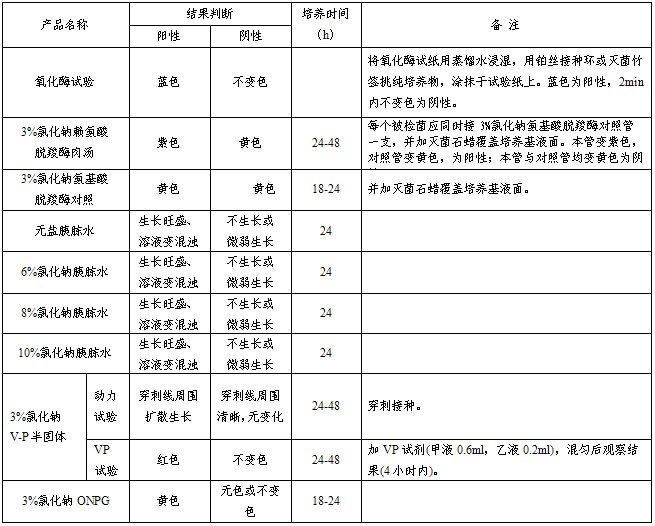用于创伤弧菌的生化鉴定,每条组成:无盐胰胨水,6%氯化钠胰胨水,8%氯化钠胰胨水,10%氯化钠胰胨水,3%氯化钠VP半固体培养基,3%氯化钠赖氨酸脱羧酶,3%氯化钠氨基酸脱羧酶对照,3%氯化钠ONPG,氧化酶试纸1包,共9种生化反应。(GB标准)