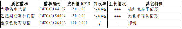 按标签用法制备培养基,接种以下质控菌株,放置30-35℃需氧培养18-72小时。 注:回收率计算时,用TSA琼脂做对照培养基。