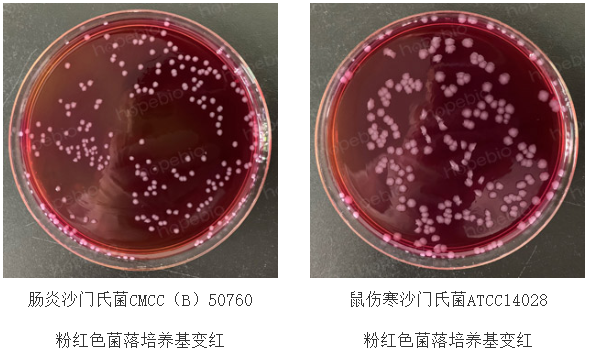 (3)沙门氏菌在BPLS琼脂上,36℃±1℃培养18h-72h,典型菌落特征为红色菌落,周围培养基变红。